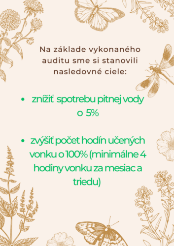 Ako ciele sme si stanovili znížiť spotrebu pitnej vody o 5% a zvýšiť počet hodín učených vonku o 100% (min. 4 hodiny mesačne/trieda).