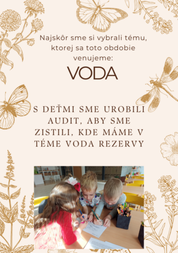 S deťmi sme sa po zvolení témy pustili do auditu k téme voda. Spísali sme silné a slabé stránky, spotrebu vody na osobu za mesiac. Výsledky sme zverejnili na nástenke v jedálni.